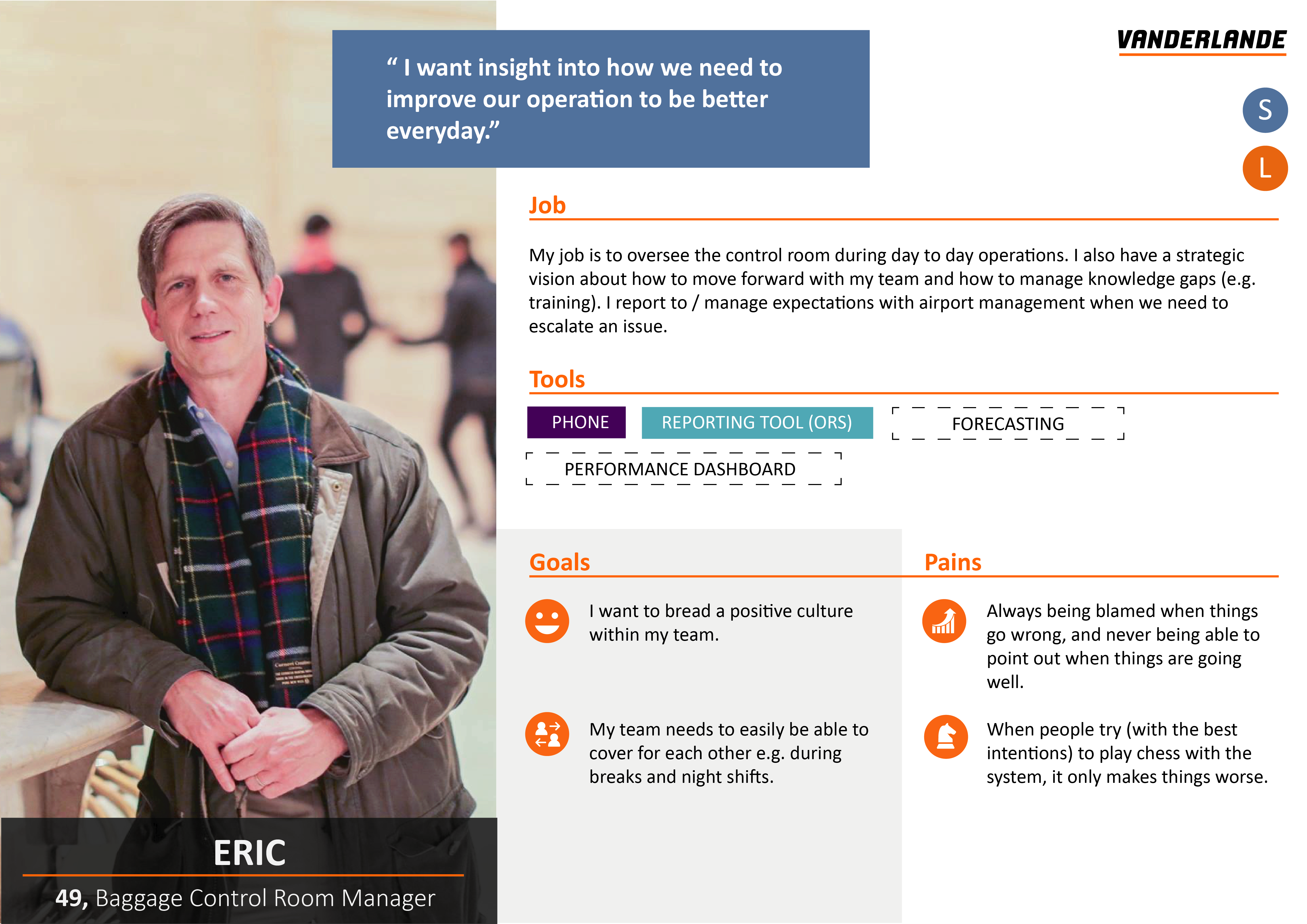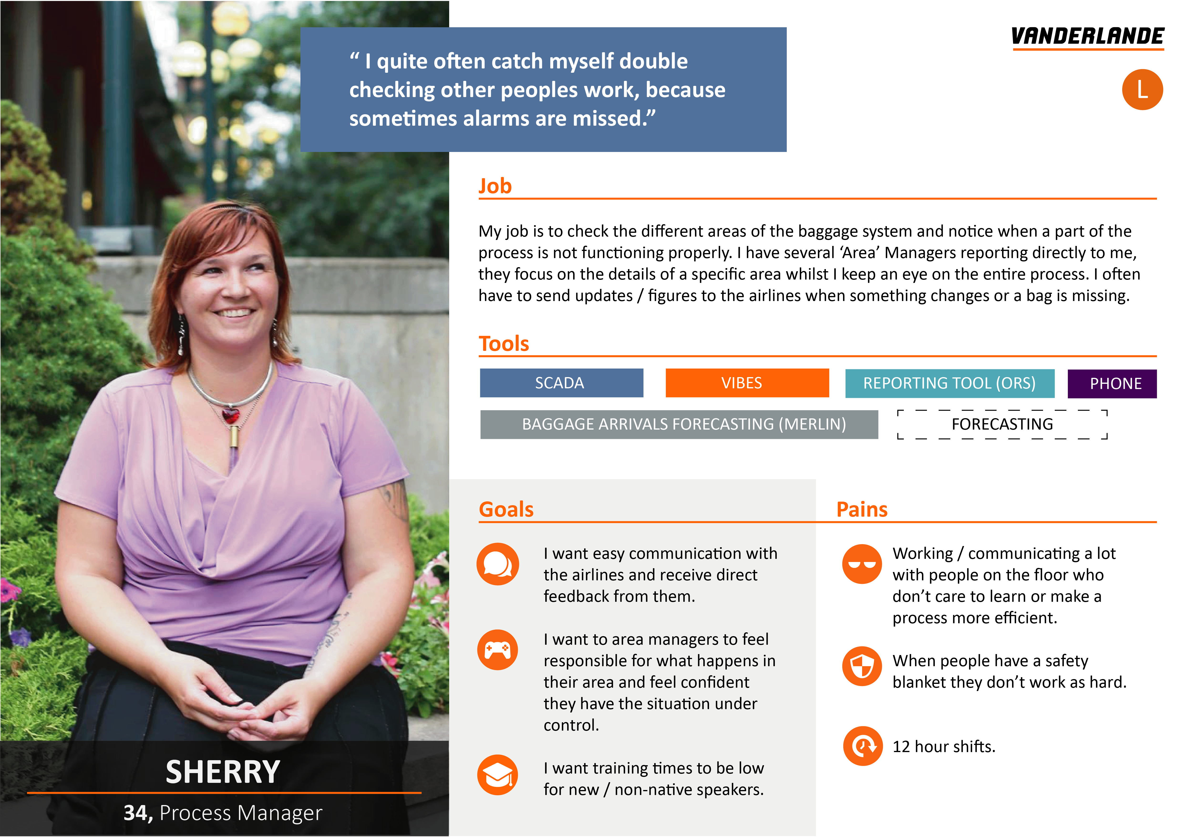 The airports industry is an extremely complex multi-stakeholder environment; airport management, airline management, baggage handlers, operators, mechanical technicians, IT technicians, security and I could go on for a while. On top of that, every airport is different, and requests different methods of being able to operate their systems. We believe our design takes to heart all the different wishes and desires of our stakeholder however, ultimately focusses on the people who use the system everyday. I have highlighted two of those users in a persona below.
